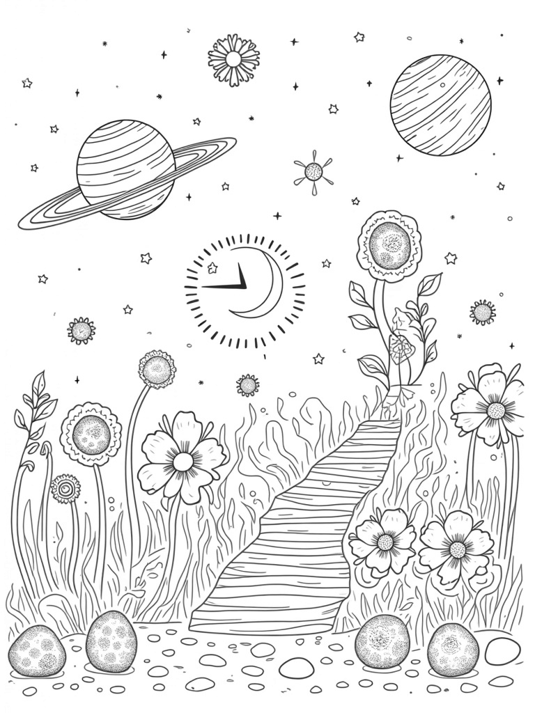 This scene is a cosmic garden that bursts with creativity! Imagine planets swirling like oversized flowers, each petal decorated with twinkling stars. Right in the center, a sun shines brightly, looking like a vintage clock face with its hands pointing toward the stars. Nearby, a crescent moon rests on a tall, twisting staircase made of shimmering comets, giving the whole scene a magical vibe.