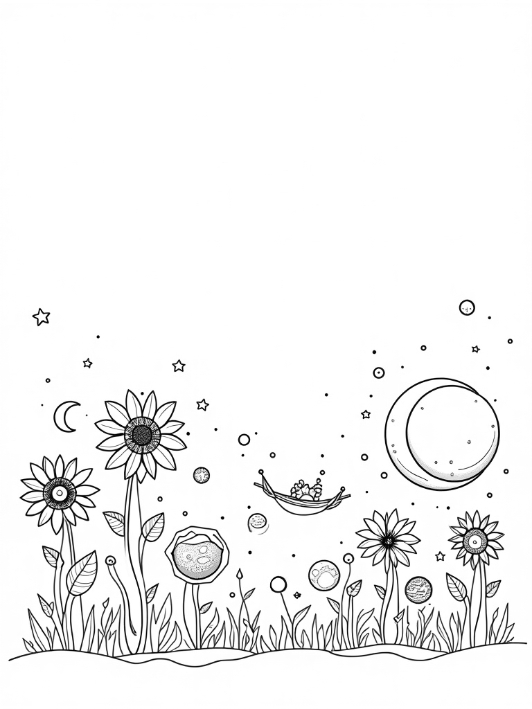 Check out this free, printable coloring page featuring a cosmic garden! With planets dangling like fruit and a crescent moon as a hammock, it's perfect for kids who love space and creativity. Grab your crayons and let the coloring fun begin!