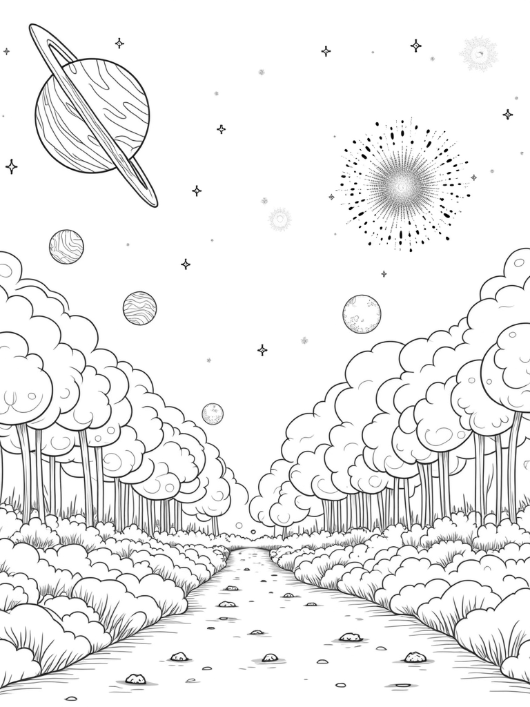 Cosmic Garden with Planets and Rocket Trees Coloring Page