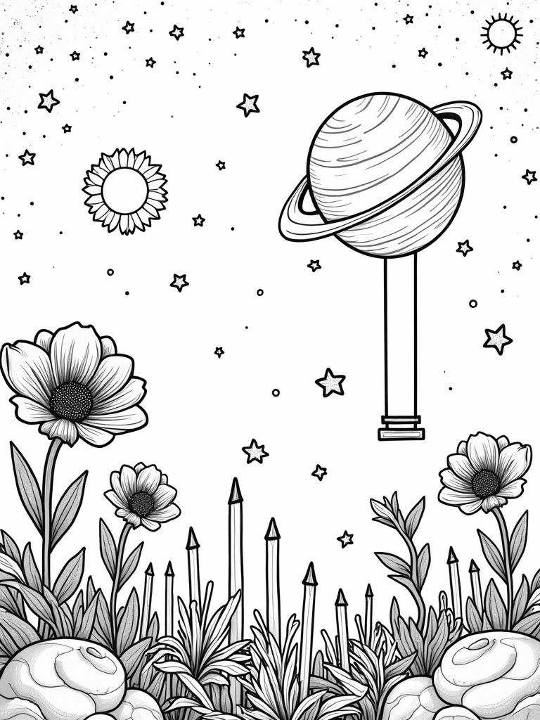 Cosmic Garden with Stardust Flowers and Orbiting Planets Coloring Page