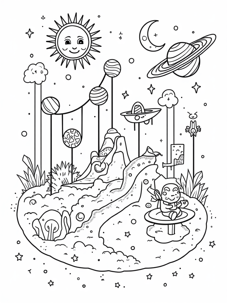 Cosmic Playground with Planets and a Smiling Sun Coloring Page