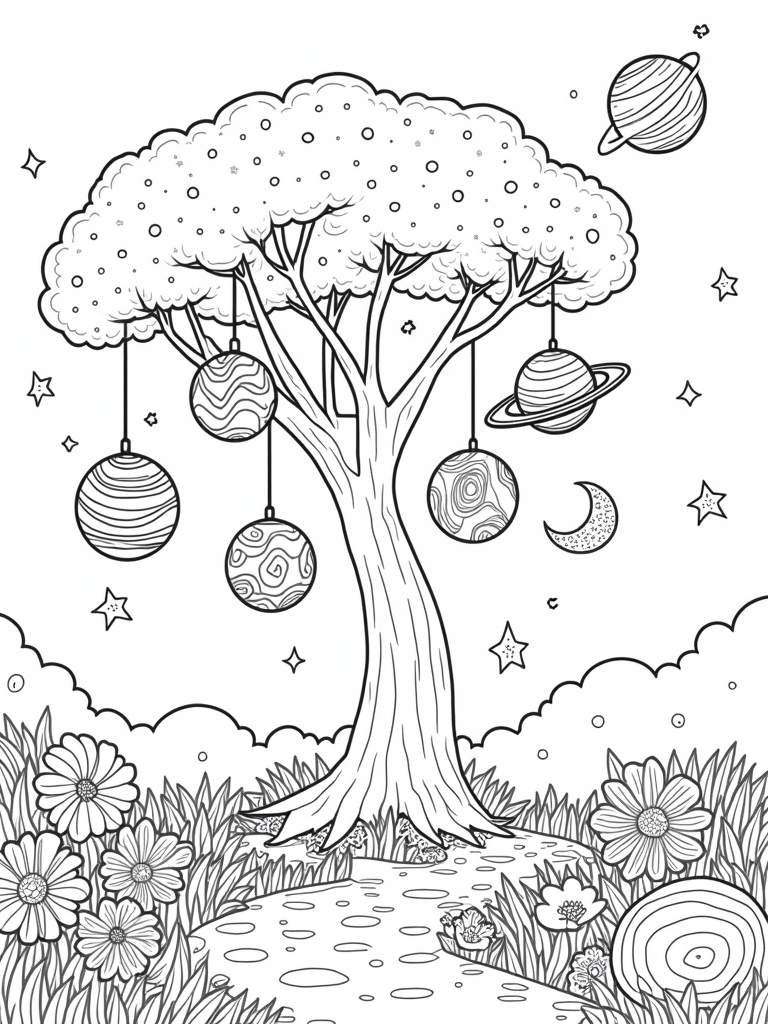 Cosmic Tree with Colorful Planets and Flowers Coloring Page