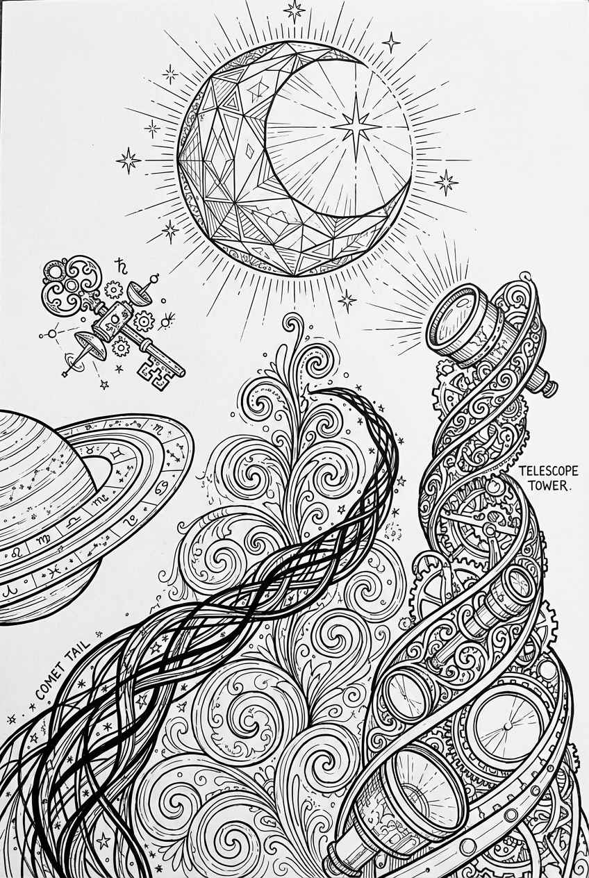 Crystal moons aren’t real—yet, but real moons can be covered in ice that looks pretty glassy. Telescopes on Earth often sit on sturdy towers, but a corkscrew shape would definitely help catch more sky. Comets get their dark tails from dust and gas that glow when the Sun’s rays hit them, so the ink‑black streak you see is a fun exaggeration for coloring. The key‑shaped satellite is a nod to old “key” symbols used by early space agencies to mark important missions. And those rings? Saturn’s rings are made of ice chunks, and astronomers love drawing tiny stars on them to map out the night sky.