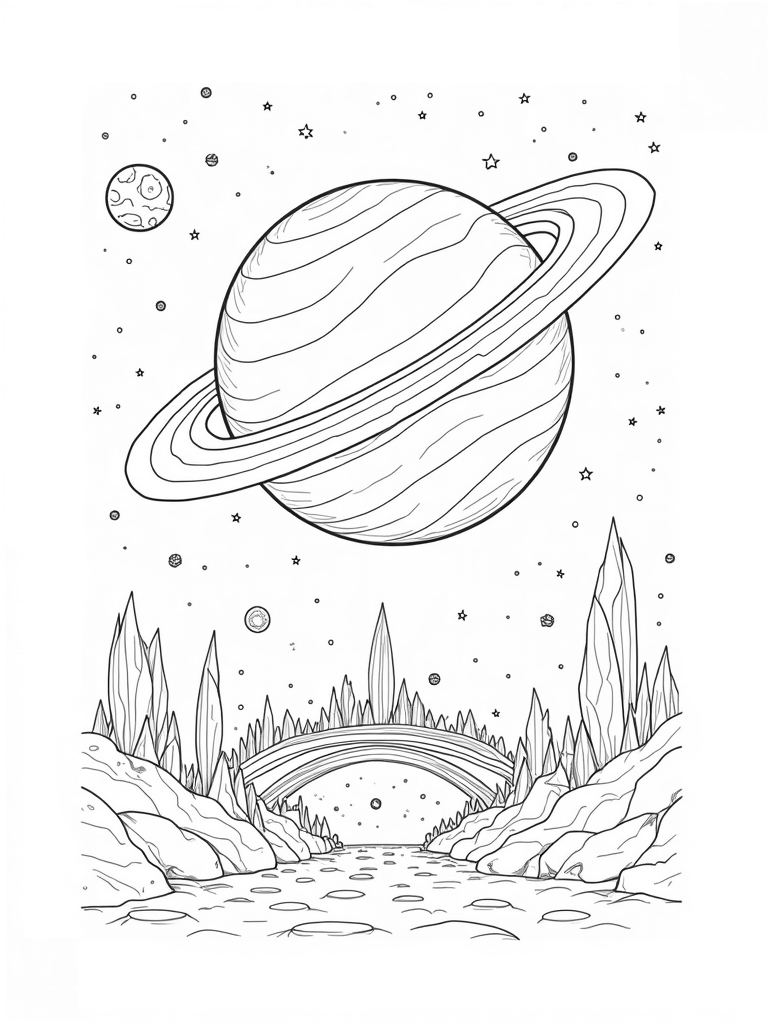 In this coloring page, a swirling galaxy wraps around a giant, glowing planet that has these cool, intricate rings. Below it, you can see a field of oversized crystals jutting out from a rocky surface, all sparkling under the starlight. It’s like a magical treasure trove waiting for you to add your colors!
