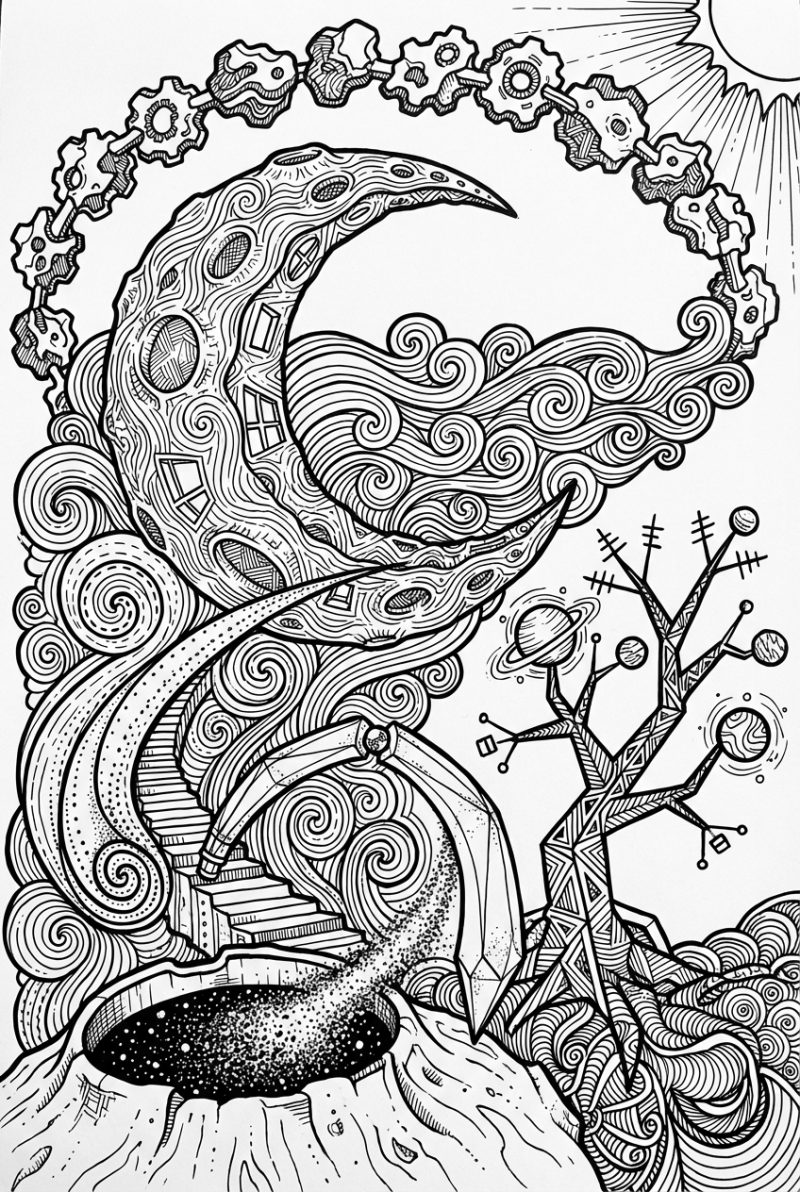 Spot the huge moon slab drifting on a swirly nebula sea—its surface is pocked with crater windows you can fill in any way you like. A comet tail curls up into a glowing staircase that leads right to a crystal telescope, arched over a crater spilling glittering stardust. To the side, a quirky satellite‑tree stands tall, its antenna‑like branches sprouting tiny planet‑shaped leaves. Around everything, a ring of gear‑like asteroids circles the scene, catching the faint glow of a hidden star. The line art is full of cross‑hatching and swirls, so there’s plenty of texture to experiment with.