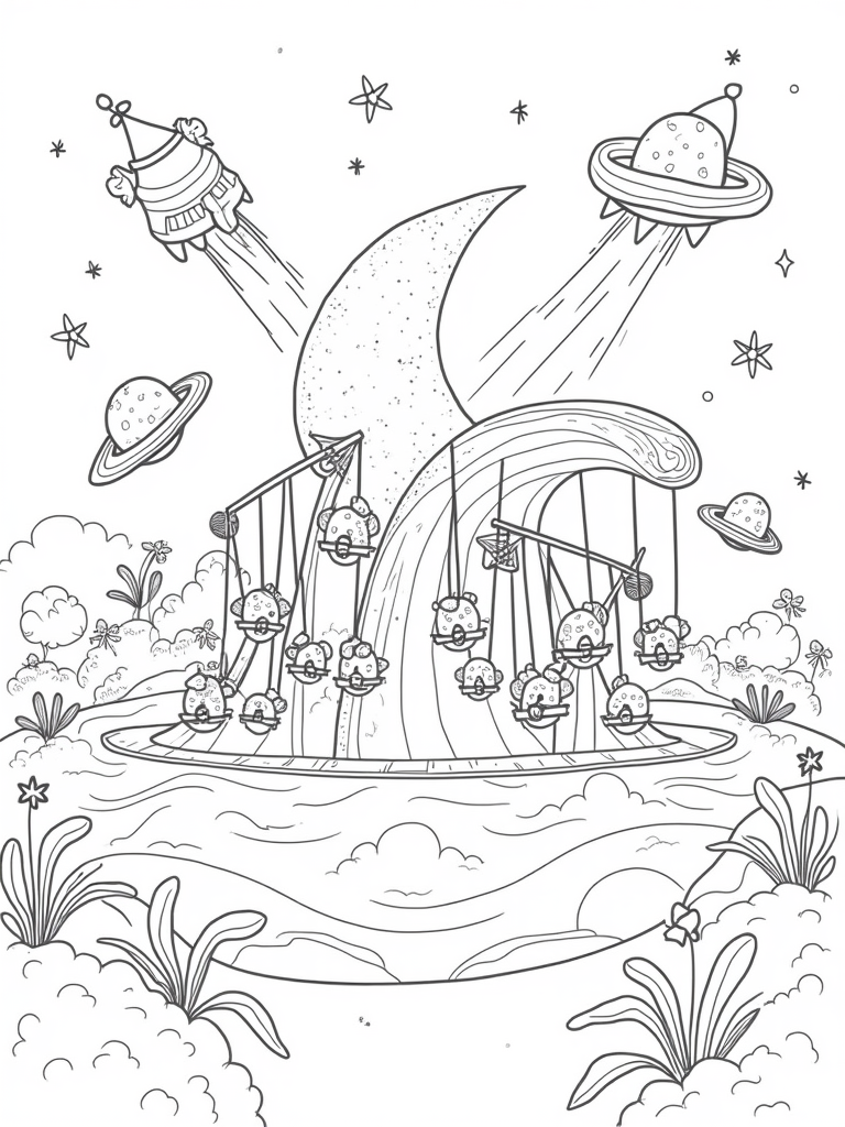 Hovering around the playground are cheerful rocket ships, each leaving behind colorful trails of smoke that add to the excitement. And let’s not forget the crescent moon in the background, cradling a field of twinkling stars that dance like pinwheels. It’s a magical setting that sparks creativity and invites kids to fill it with their favorite colors.