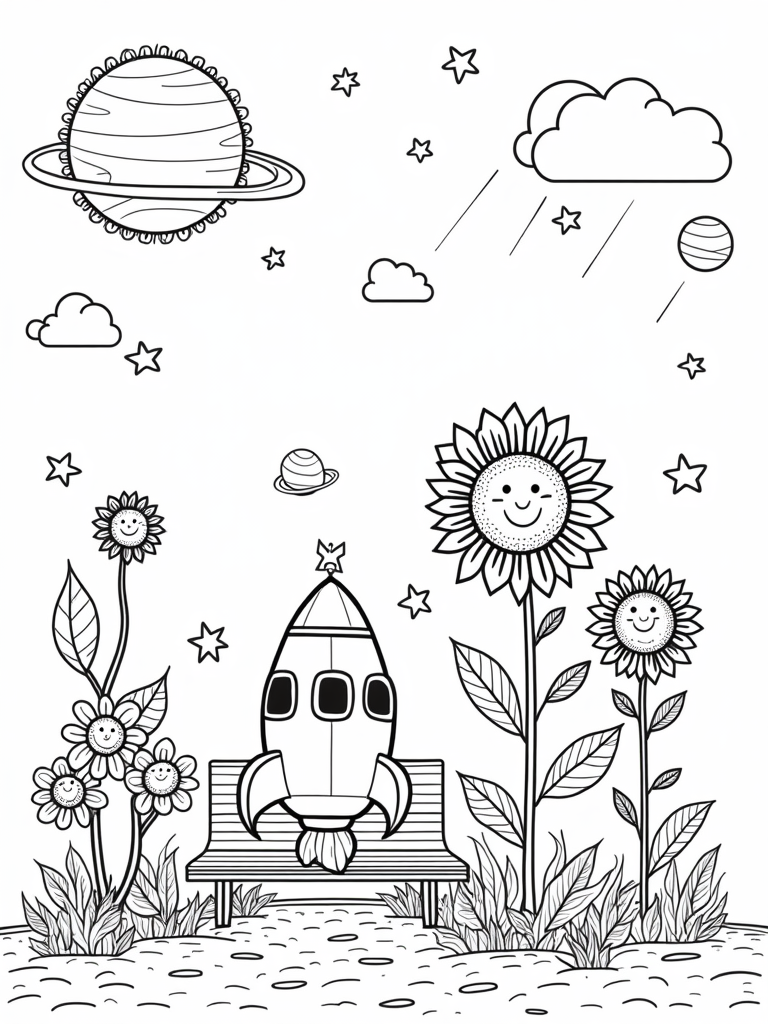 This coloring page brings you a delightful space garden where colorful planets hang like fruits from swirling vines. A friendly rocket ship rests on a fluffy cloud, and you can peek inside its wide open windows to see a glowing star! Beneath it, a moon-shaped bench invites you to sit among cheerful alien flowers that have smiling faces, making the whole scene feel extra friendly.