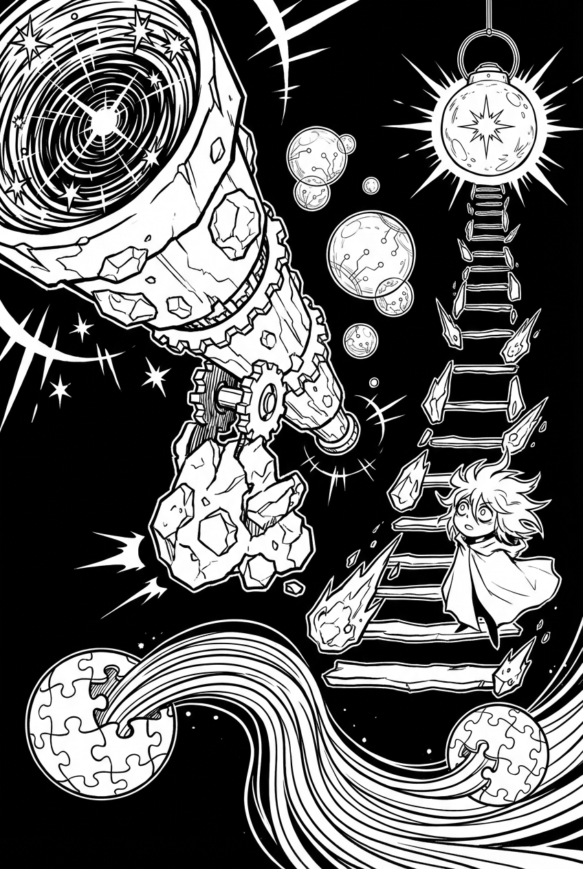 Look closely and you’ll see a giant telescope made out of a cracked asteroid, its eyepiece swirling like a tiny galaxy. Beside it float crystal satellites that look like clear pearls, and a ladder of jagged meteor shards climbs up to a glowing moon lantern hanging in the black void. Down below, a thin ribbon of starlight stretches between two puzzle‑piece planets that orbit each other.