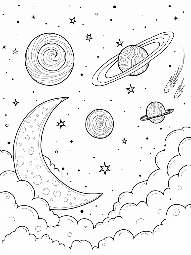 You’ve got a swirling galaxy filled with oversized stars that look like they came straight from a candy shop! These spiraling stars twist and turn, making the whole scene feel magical. In the foreground, a big, friendly crescent moon rests comfortably on a bed of soft, fluffy clouds, each one decorated with cool patterns that would be fun to color. Nearby, a group of planets floats by, each with its own unique rings and textures, just waiting for your favorite colors.