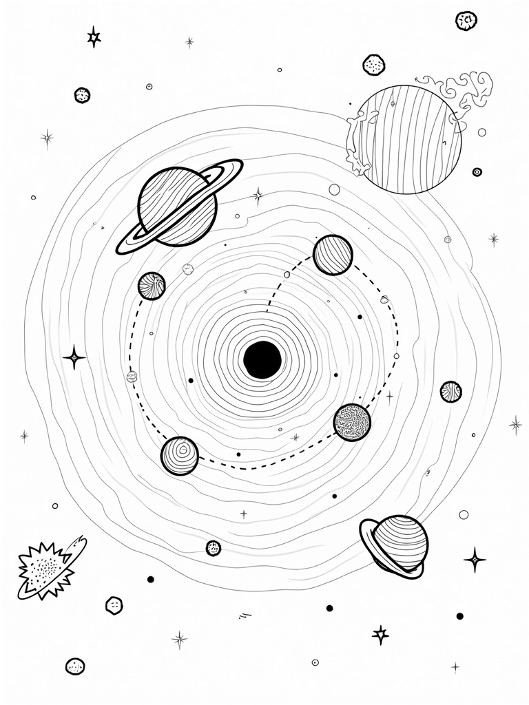 This coloring page takes you to a swirling galaxy filled with oversized, geometric planets all lined up in a cool spiral formation. In the center, a mysterious black hole draws your eye, surrounded by twinkling stars and intricate patterns. You can also spot a comet zooming by, leaving behind a trail of dotted lines and fun abstract shapes. Don't forget the asteroids drifting lazily around, each one with its own unique texture!