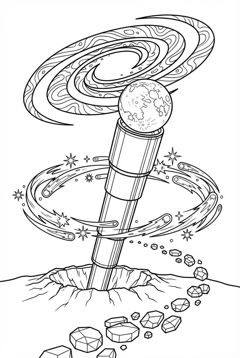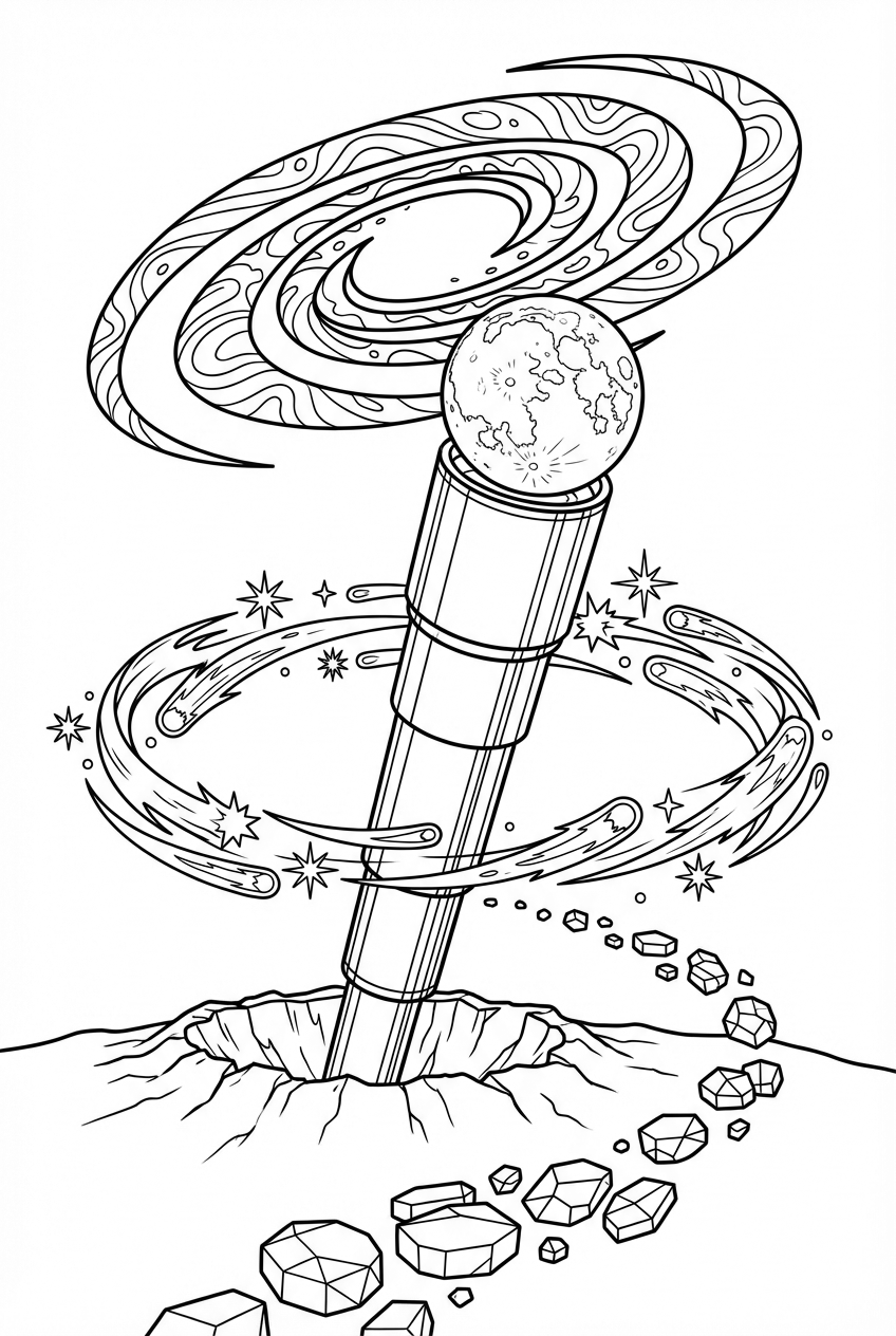 Start with the moon – maybe a bright silver or a deep navy for a night‑time vibe. The telescope shaft can be a sleek metallic gray or a bold primary color if you want it to pop. For the comet tails, think fiery oranges and reds, and the crystal stones work great in pastel blues or greens. Let the galaxy swirl with purples, pinks, and star‑burst yellows. Play around and make the scene yours.