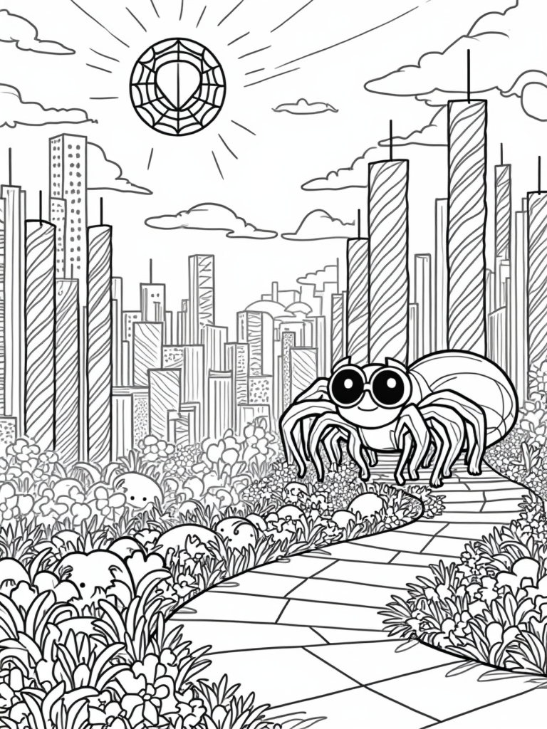And let’s not forget the giant cartoonish Spider-Man emblem glowing softly in the sky. It adds a cheerful touch to this whimsical cityscape. This coloring page is sure to spark creativity and joy!