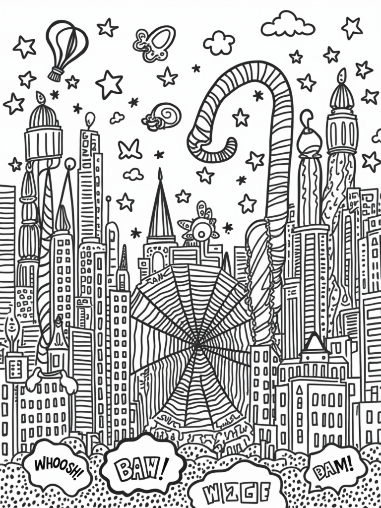 This free, printable coloring page in the spiderman category features a vibrant cityscape with candy cane skyscrapers, a friendly spider web, and playful comic book panels. Perfect for sparking your imagination while coloring!