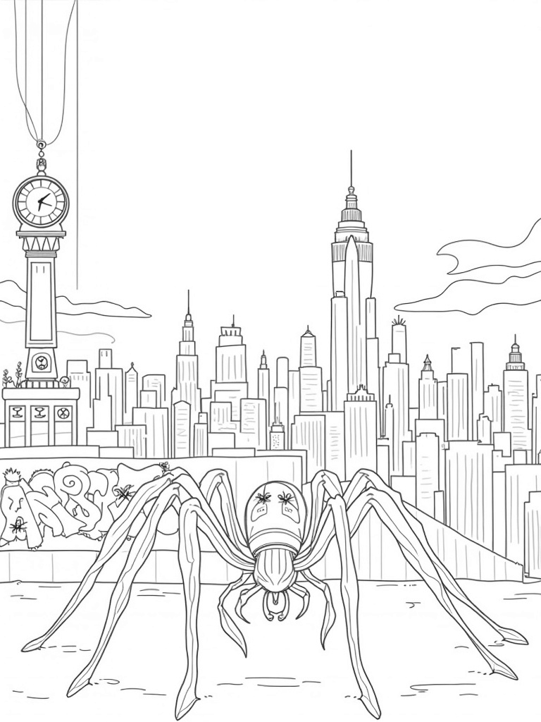 The graffiti on the wall nearby really pops with bright colors and abstract spider designs, creating a striking contrast against the black-and-white buildings. And don’t miss the large spider silhouette in the foreground! Its long legs stretch across the page, inviting you to get creative with your coloring choices. Will you give the spiders some wild colors or keep it classic? The possibilities are endless!