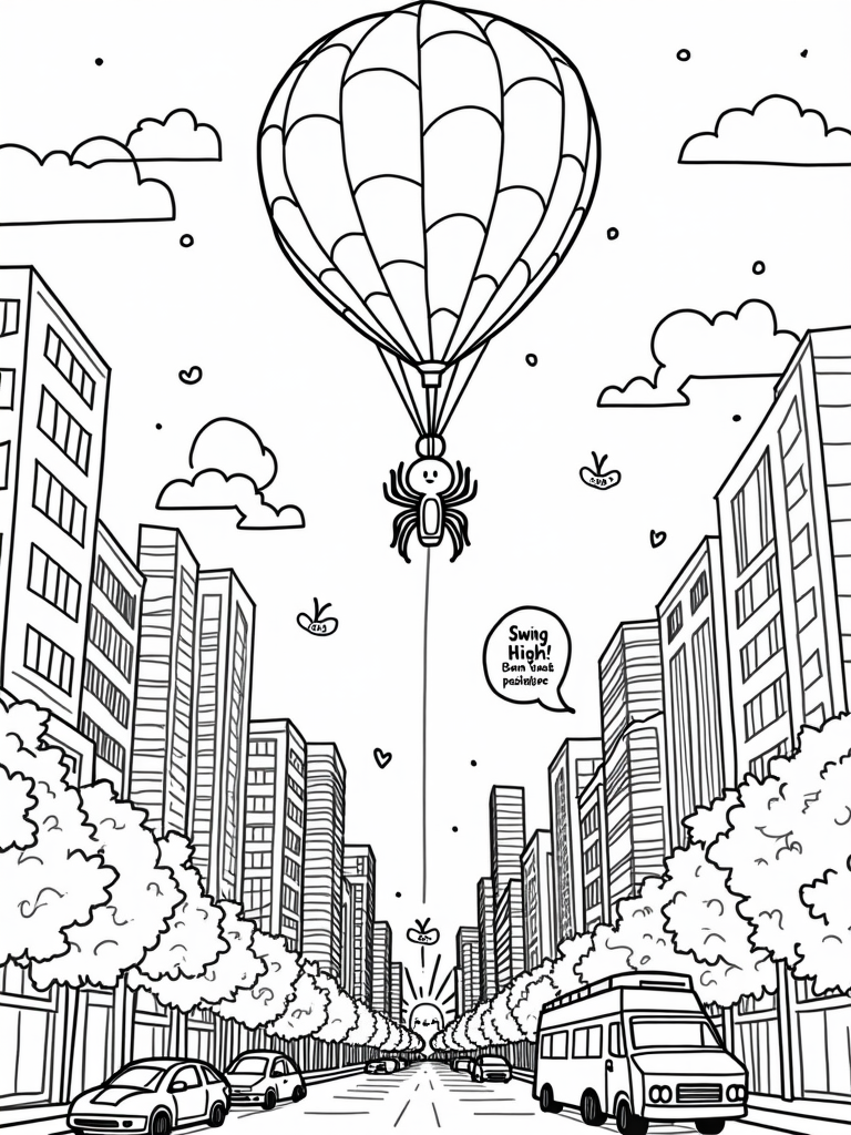 Below the skyline, speech bubbles pop up with playful phrases like 'Swing High!' and 'Web Power!'—perfect for getting kids excited about coloring. Cartoon-style vehicles zoom by on the busy street, making the whole picture feel vibrant and full of life. And don’t miss the friendly sun smiling down, casting warm rays over everything. It’s a perfect day for some fun!