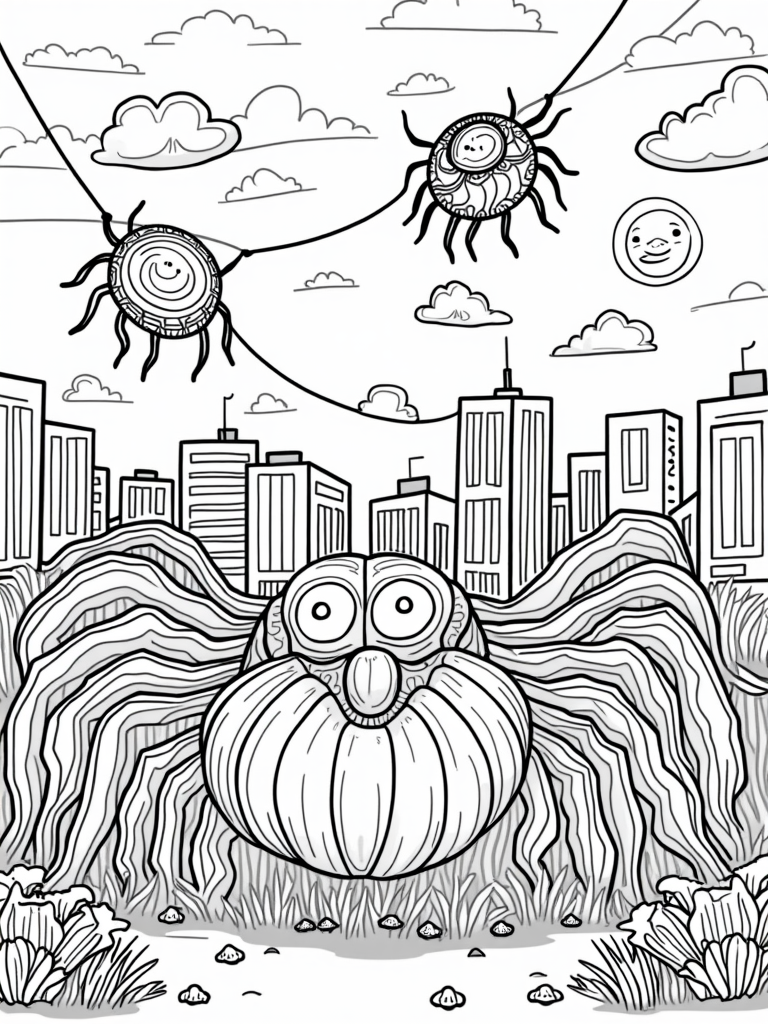 City Skyline with Friendly Spiders and Whimsical Buildings Coloring Page