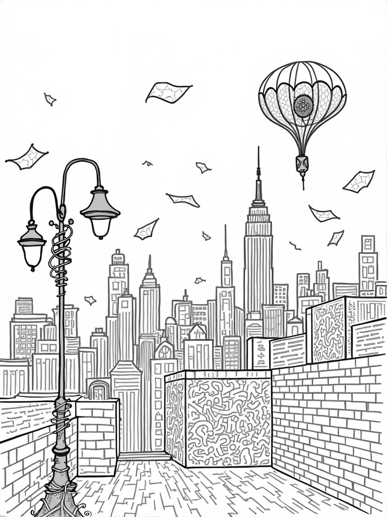 City Skyline with Spider Clock and Graffiti Coloring Page