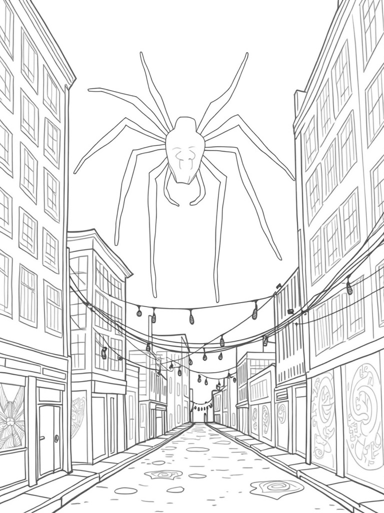 Down below, the street scene is alive with energy. You’ll find tangled wires and colorful graffiti art showcasing spider symbols, adding a fun, urban edge. Scattered on the ground are comic book pages fluttering in the breeze, hinting at stories waiting to be told. It’s a lively mix that invites kids to get creative with their colors!