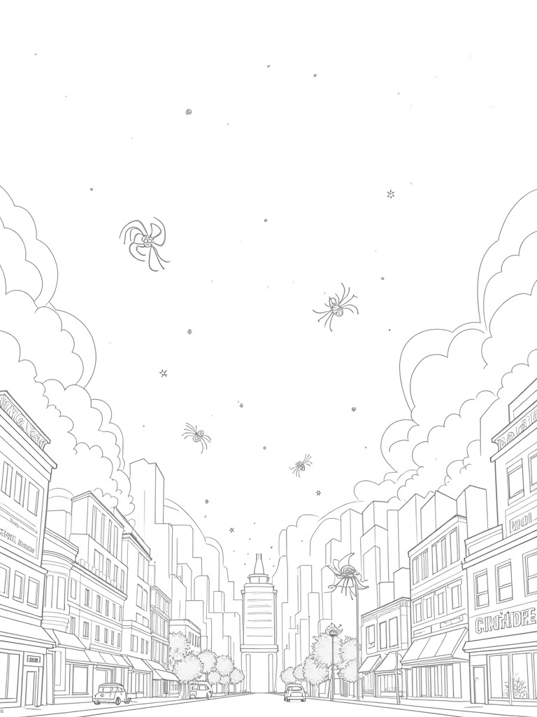 Imagine a buzzing city skyline lit up by a blanket of stars! In this scene, giant spider webs stretch between the towering skyscrapers, creating a delicate lacework that’s just waiting for your colorful touch. Oversized cartoon spiders cling to the webs, their legs curling in all sorts of playful ways, adding a fun twist to the vibrant city atmosphere.
