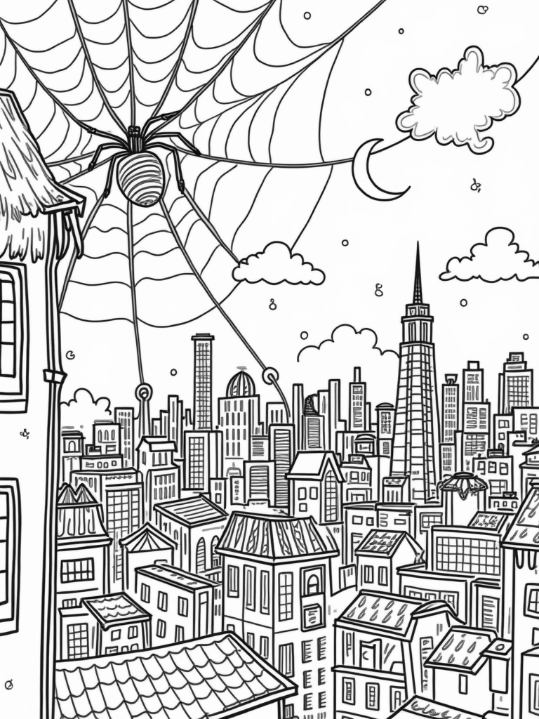 City Skyline with Spiderwebs at Dusk Coloring Page