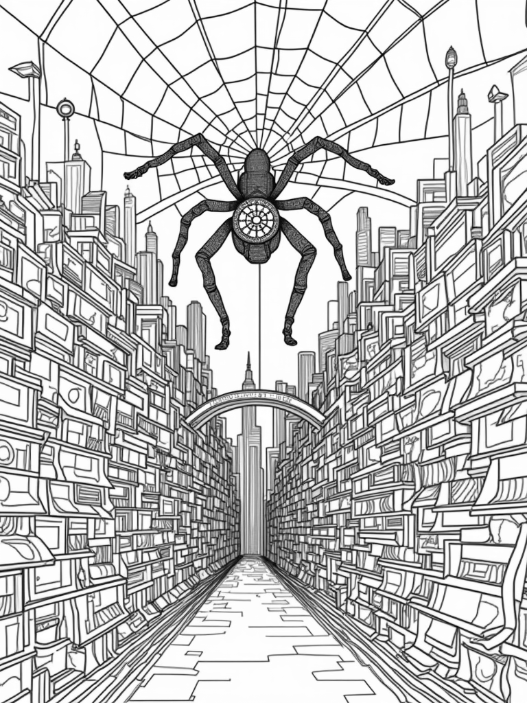 Imagine a bustling city where skyscrapers look just like giant spiders weaving their webs high above! At the heart of this vibrant scene stands a massive clock tower shaped like a spider, glowing with all sorts of bright colors. Below, the streets are covered in a wild array of comic book pages that are bursting with action. Each page tells its own exciting story, just waiting for your favorite colors!