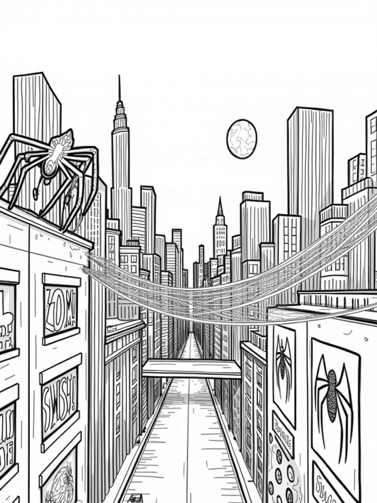 The scene shows a sprawling cityscape where huge spider webs stretch between towering skyscrapers, making it look like a giant spider's playground. In the foreground, a giant spider silhouette lounges on a rooftop, its long legs reaching out over the buildings. Below, the streets are alive with oversized comic book panels featuring words like 'ZOOM!' and 'SWISH!' that add a playful vibe to the whole picture.