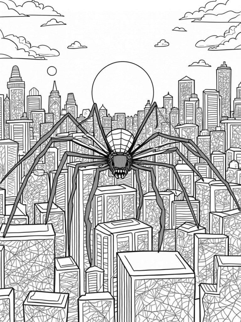 Check out this free, printable coloring page featuring a cityscape spiderweb and a luminous spider. Perfect for kids who love comics and creative art! Get ready to bring this vibrant scene to life with your colors.