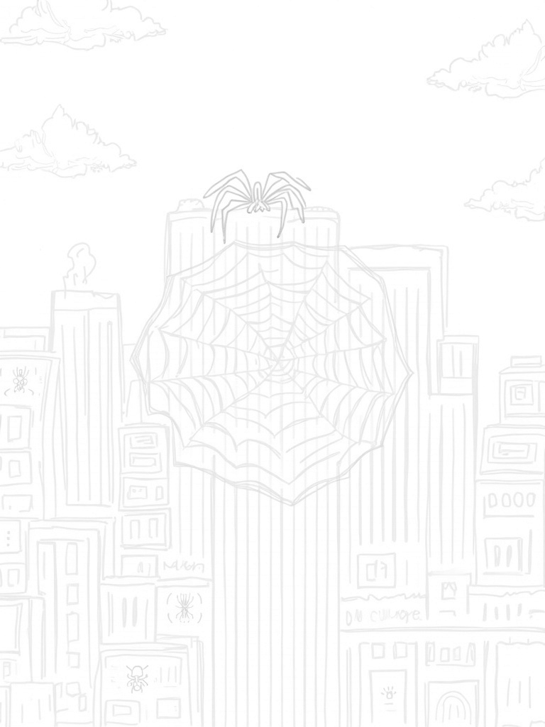 Look closely, and you'll spot a huge, stylized spider silhouette perched on top of one of the buildings, its legs stretching elegantly. Below, a fun mix of colorful comic book panels floats through the urban landscape, each showcasing different spider designs. It’s a perfect way to combine a love for art and comic storytelling. The fluffy clouds above even seem to mimic the curves of the web, adding to the playful vibe of the scene.