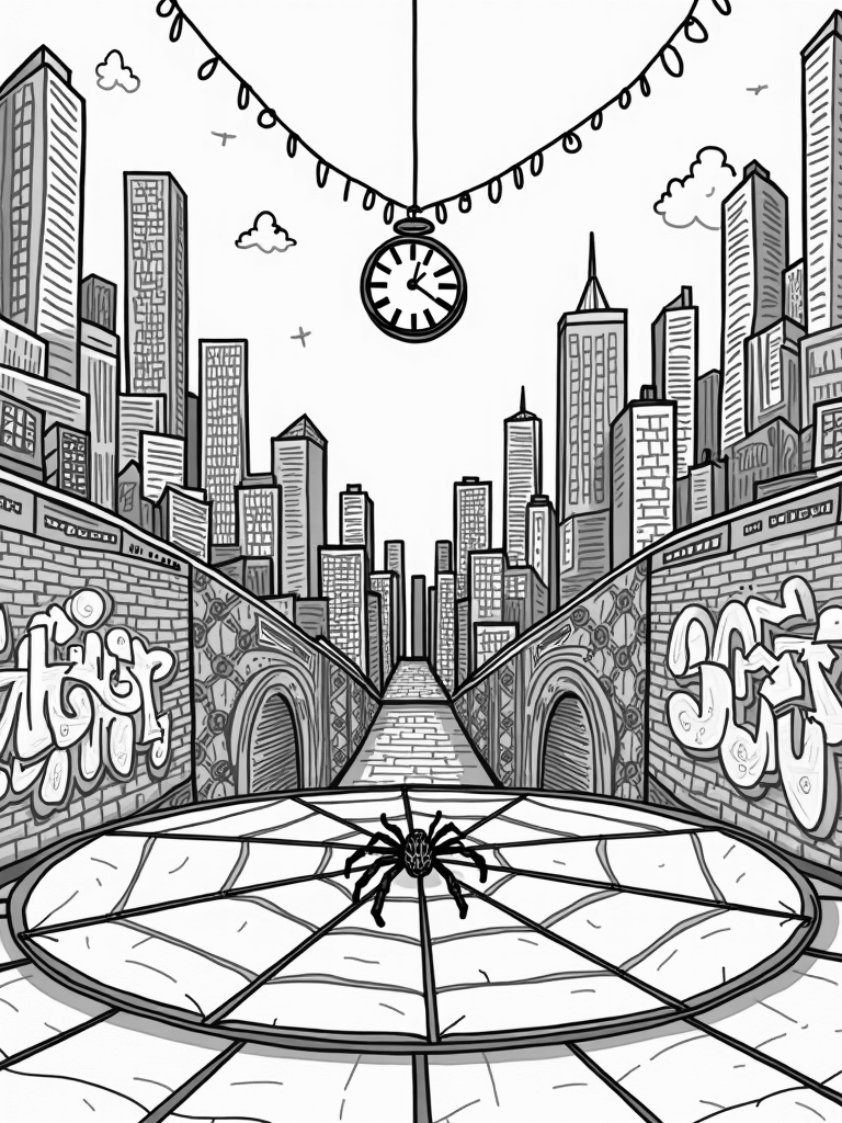 Right below the skyscrapers, the walls are bursting with color. The graffiti showcases all sorts of spider motifs, making the city feel alive and full of creativity. It’s a feast for the eyes and perfect for adding your own splash of color!