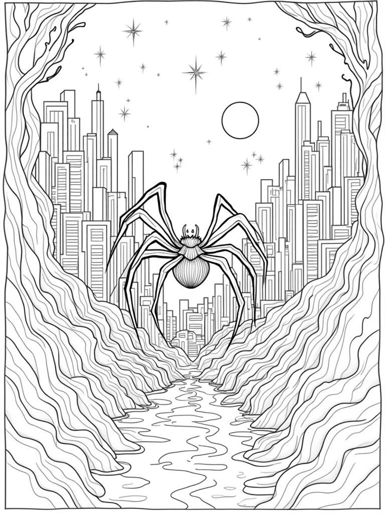 Imagine a city where the skyscrapers don’t just stand tall but twist and curl like vines in a jungle! That’s what you’ll find in this vibrant coloring page. A giant, stylized spider sits right in the heart of it all, with its long legs forming bridges that connect the buildings. Below, a swirling river of paint flows through the streets, splashing colors everywhere. It’s a wild mix of nature and urban life!