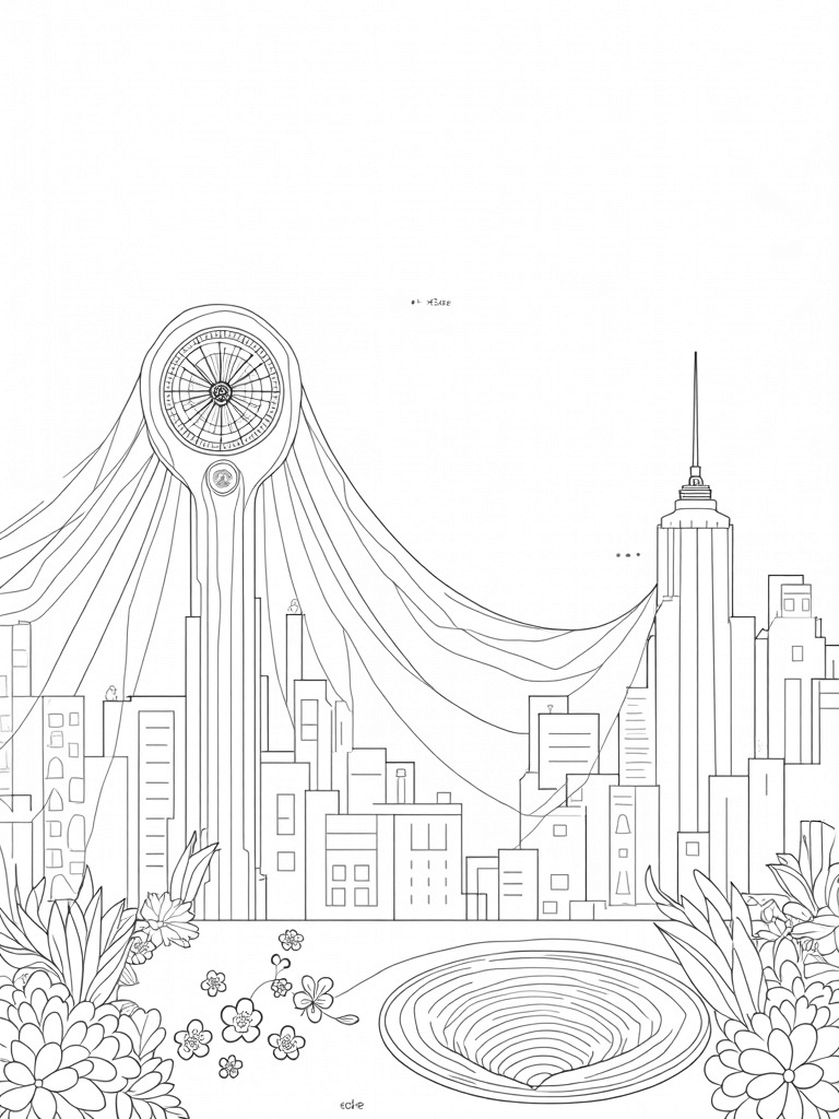 Dusk Skyline with Spider-Shaped Clock Tower Coloring Page