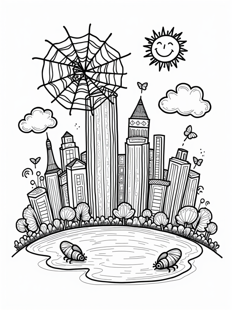 Friendly Spider in a Colorful Cityscape Coloring Page