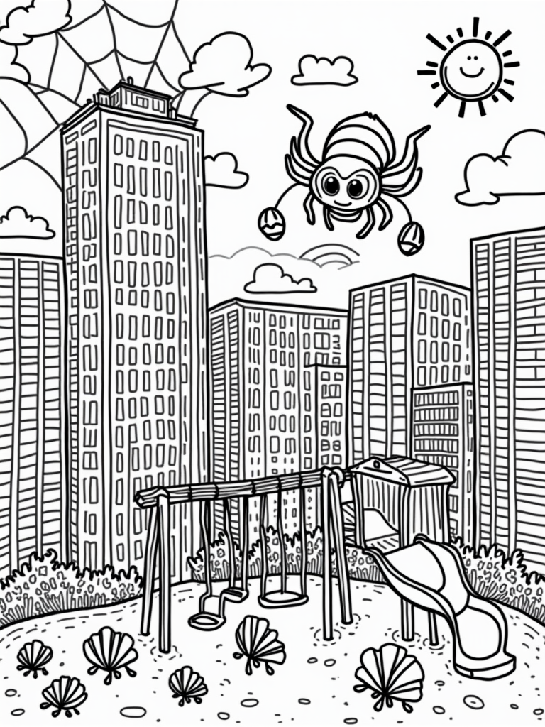 Friendly Spiders and Colorful City Playground Coloring Page