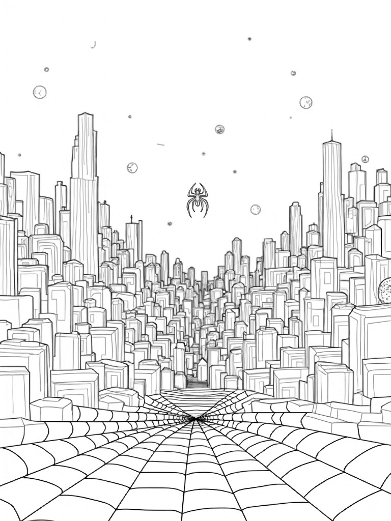 Check out this free, printable coloring page featuring a moonlit cityscape with giant spiderwebs and superhero symbols. Perfect for kids who love spiderman and want to unleash their creativity with some fun coloring!