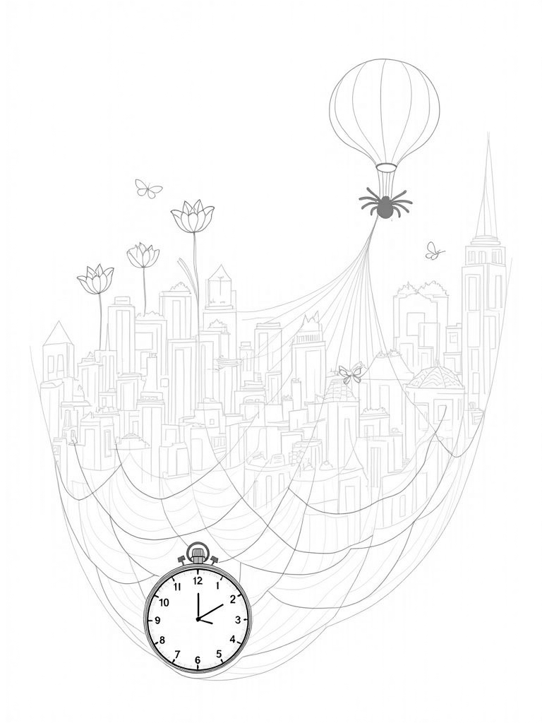 Above it all, there’s a giant, translucent spider-shaped balloon that lazily drifts through the air, casting a playful shadow over the rooftops. It adds a whimsical touch to the scene, don’t you think? And in the foreground, a massive spider web stretches across a round clock, frozen at midnight. Delicate butterflies flutter around, adding a bit of magic to this urban landscape.