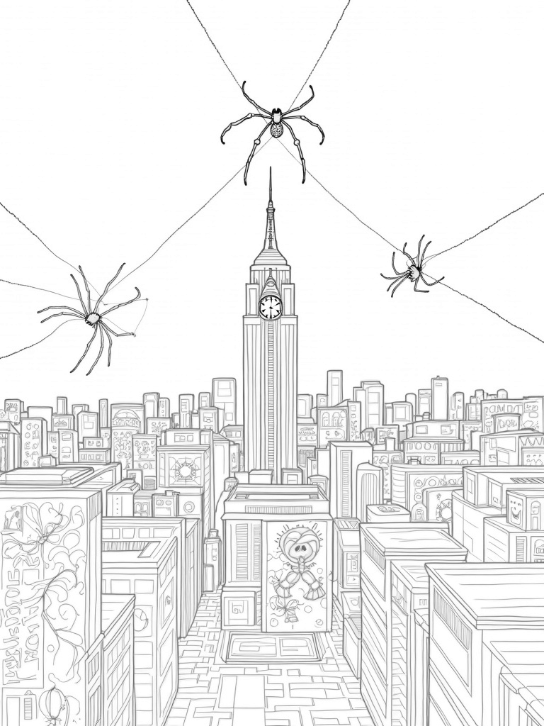 Check out this free, printable coloring page of a spider-themed cityscape! With a giant clock tower, colorful graffiti, and oversized spider silhouettes, it’s perfect for fans of all things spider. Grab your coloring tools and get ready to bring this scene to life!
