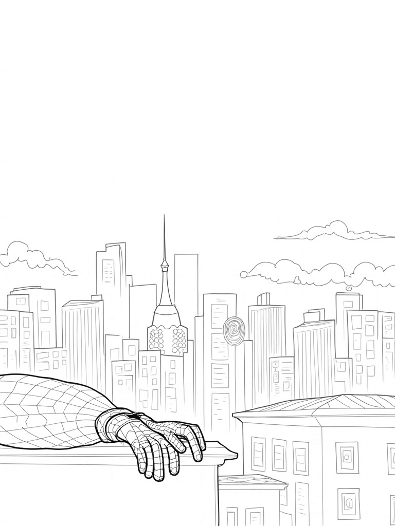Imagine the colors you want to use as you bring this scene to life! Will you go for classic red and blue for Spider-Man or mix it up with your own unique palette? The oversized Spider-Man gloves resting on the ledge are just waiting for your artistic touch. Color them with your favorite shades and let them pop against the skyline. There are so many ways to make this page your own!