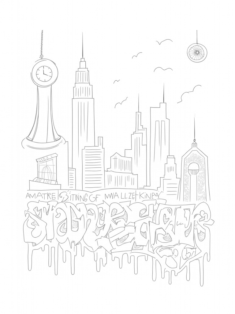 Check out this free, printable coloring page featuring a vibrant city skyline with a spider-shaped clock and colorful graffiti. Perfect for kids who love Spider-Man and want to unleash their creativity with some fun coloring!