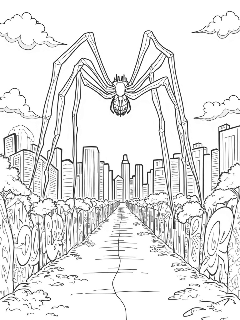 In the foreground, colorful graffiti walls come alive with spider symbols and web patterns, just waiting for your imagination to fill them with color. There’s so much detail to explore, making it perfect for kids who love to express their creativity. Whether you go for bold colors or soft pastels, this coloring page is sure to inspire some fantastic artwork.