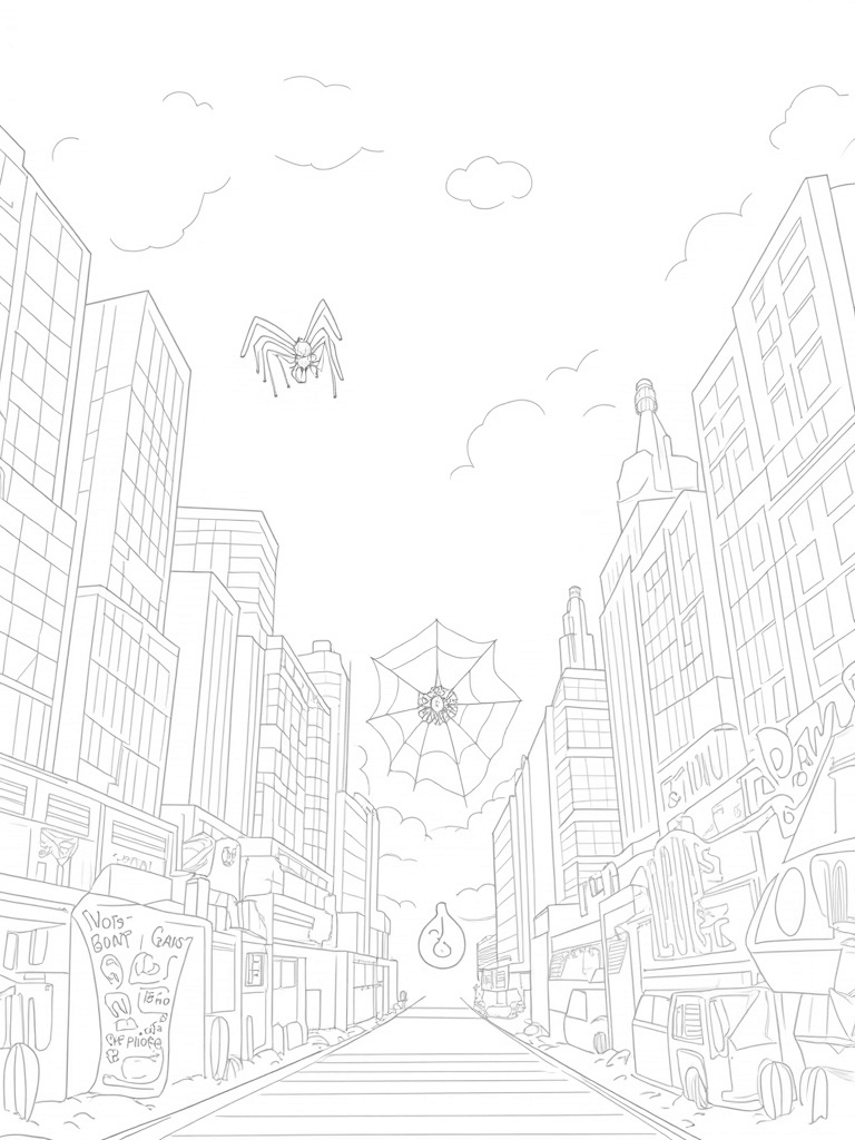 If you look closely in the background, there’s a giant spider symbol looming over the skyline. It casts a shadow over the city, adding a hint of mystery to this lively scene. Perfect for kids who love superheroes and want to bring their own creativity to life!