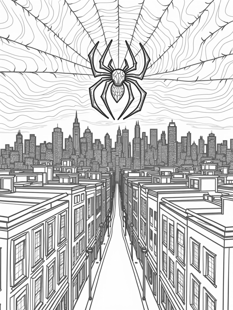 This coloring page showcases a stunning city skyline at twilight, where tall skyscrapers reach up to a beautifully swirled sky. Between the buildings, you’ll find intricate webs connecting everything together, almost like a giant spider's playground. Right in the center, there's a bold spider emblem that adds a cool twist to the cityscape.