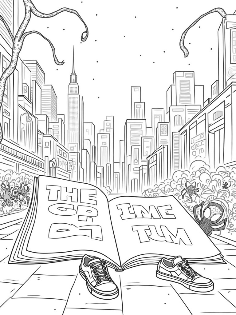 To add a fun twist, colorful graffiti spiders are climbing up a nearby wall. They’re not scary at all; they actually bring a splash of color to the urban scene. This coloring page is perfect for adding your own artistic flair!