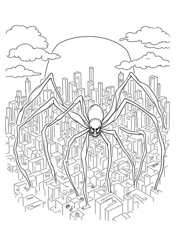 Grab this free, printable coloring page featuring a sprawling cityscape with a giant spider! Perfect for kids who love creativity, this design invites colorful imagination and fun. Dive into the details and fill it with your favorite shades!