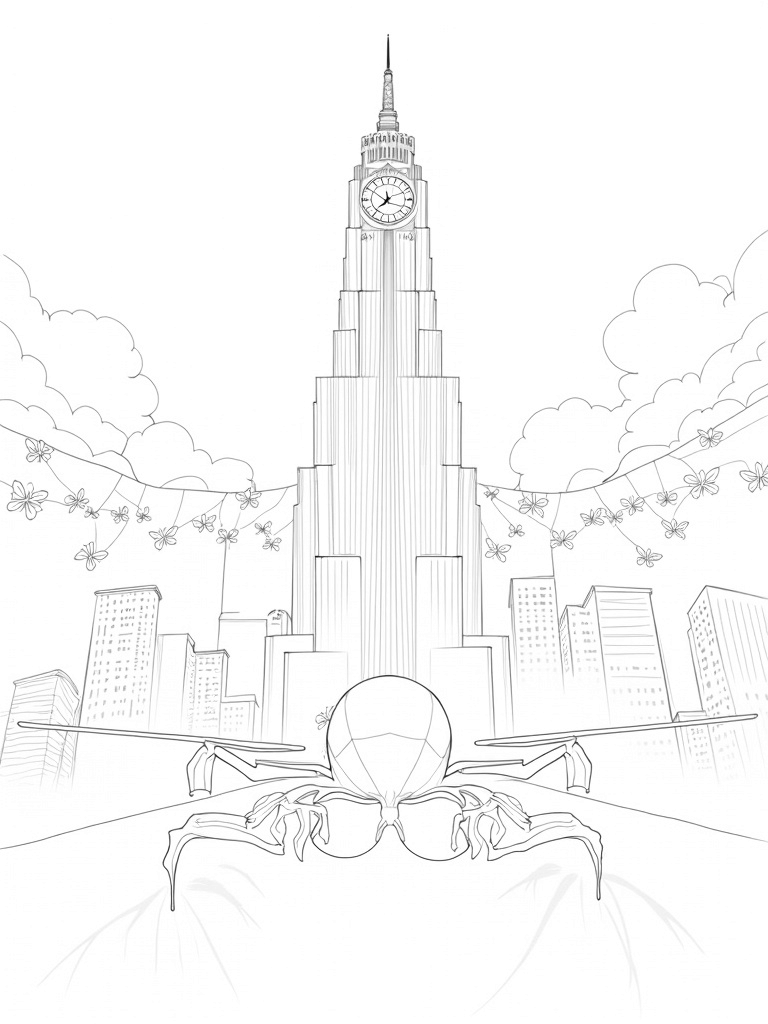 Twilight Cityscape with Spider Clock Tower Coloring Page
