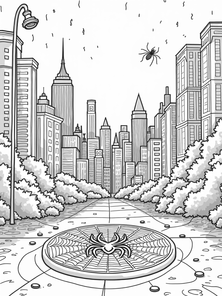 As you color, don’t forget to look up! A distant silhouette of a spider hangs in the starry sky, completing this whimsical scene. This coloring page invites you to bring the city to life with your own colors and imagination.