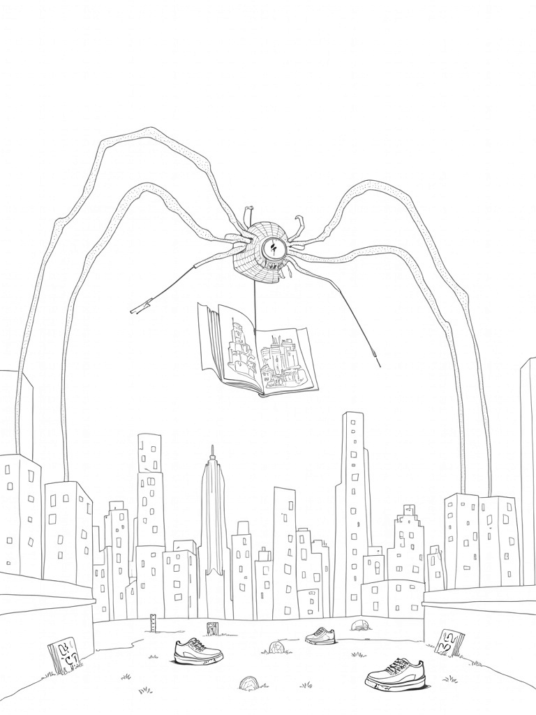 Twilight Urban Skyline with Spider Clock Tower Coloring Page