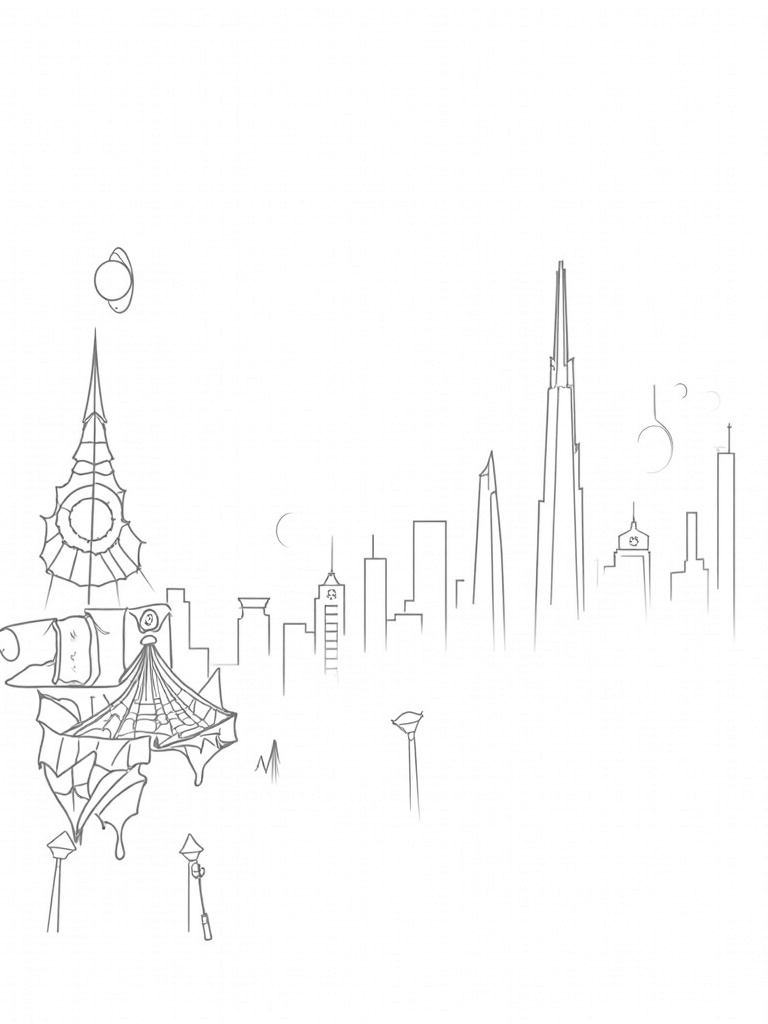 Twilight Urban Skyline with Spider Clock Tower Coloring Page
