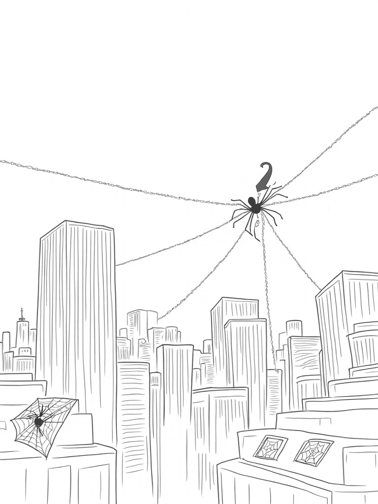 If you look closely at the rooftops, you'll see oversized comic book panels featuring different web-themed designs. These panels invite you to use your imagination while you color. Plus, delicate, oversized spiders crawl along the edges, their legs perfectly aligned with the strands of the webs. It’s a playful mix of urban life and superhero flair!
