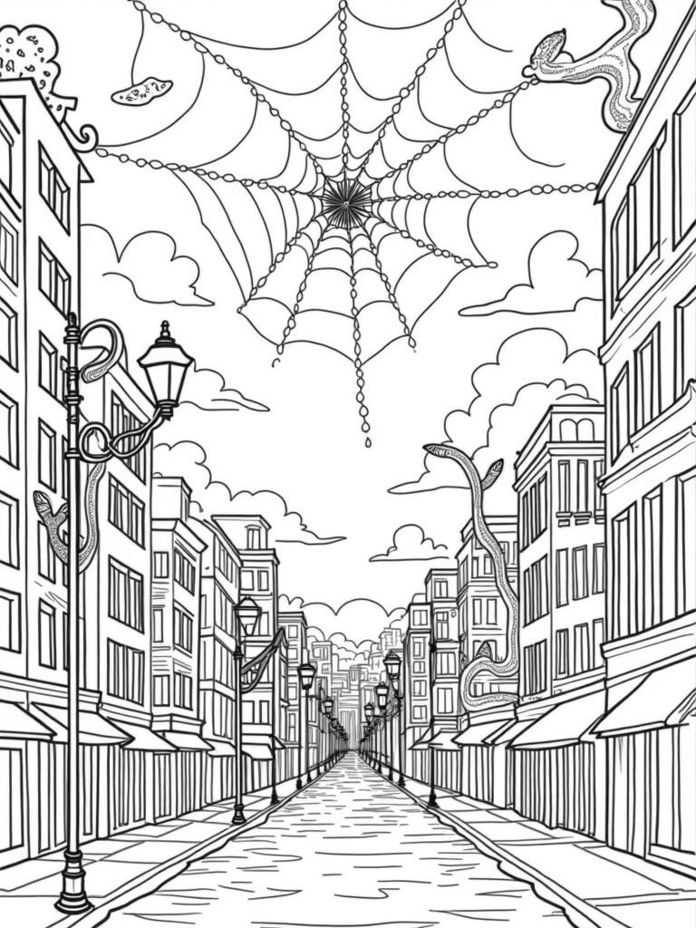 Imagine a city where the skyscrapers twist and curl like vines, all under a beautiful twilight sky! In this coloring page, you'll find a giant spider web hanging between two tall buildings, sparkling with dewdrops and colorful beads. Plus, check out those oversized cartoonish spider legs playfully holding onto a streetlamp. It’s a mix of imagination and city life!