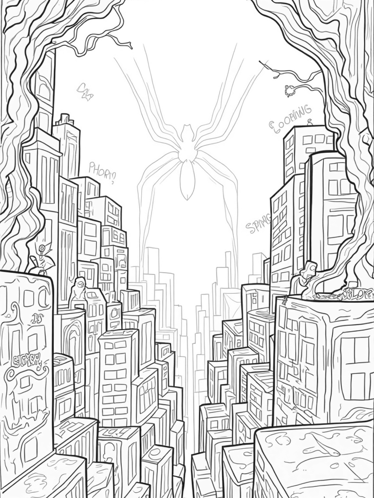 Imagine a city where the skyscrapers don't just stand tall but twist and spiral like giant vines! This coloring page captures that wild scene, with intricate webs connecting the buildings and catching the light. Can you spot the giant spider silhouette looming in the background, almost like it's watching over the city? Its long legs stretch out, framing the whole picture perfectly.